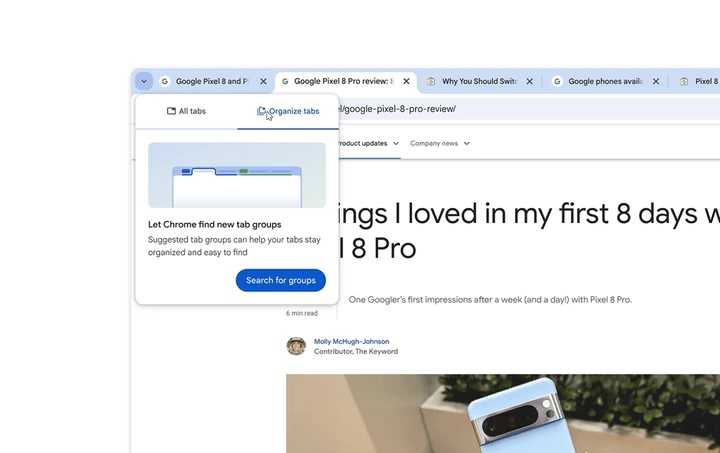 Tab organizer, ini adalah sebuah fitur yang bertujuan untuk membuat pengelolaan banyak tab lebih efektif, dimana saat ini pengguna bisa klik kanan tab dan memilih opsi “Organize Similar Tabs” atau menggunakan menu drop down arrow, Chrome akan mengusulkan grup tab berdasarkan tab yang saat ini tengah dibuka.